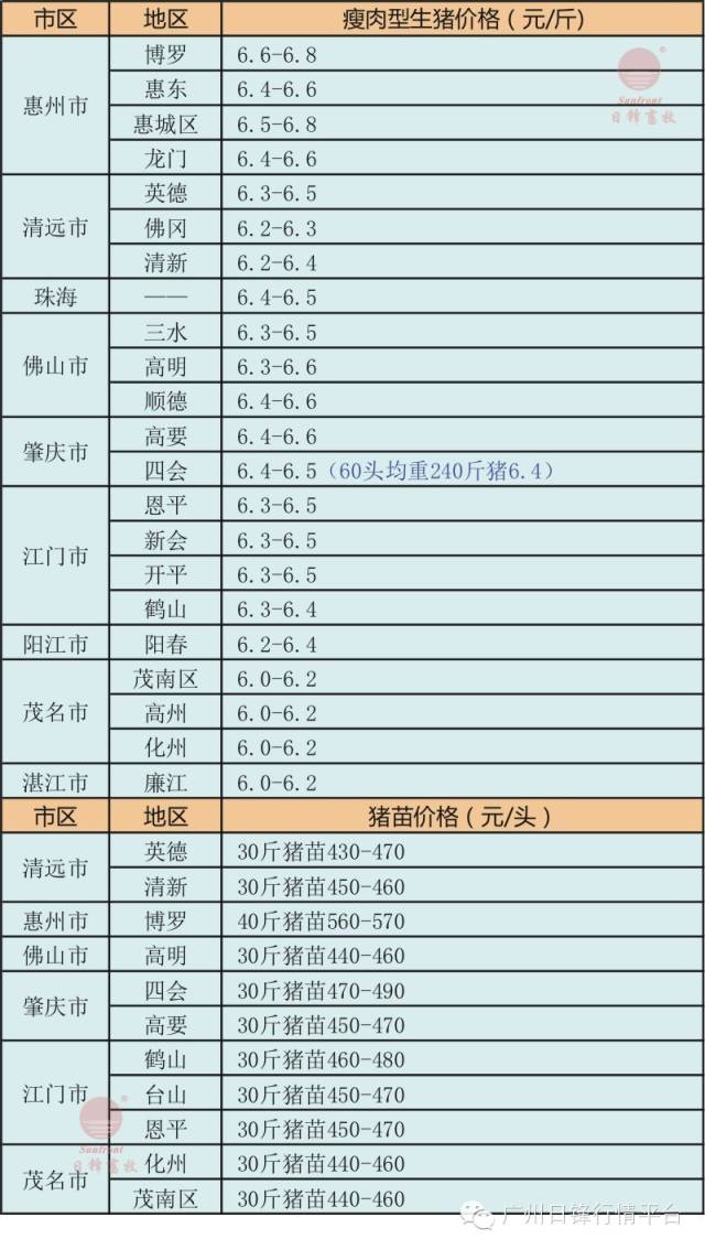 提示:以上部分猪价信息由广州日锋一线工作人员实地收集,不同地区不同猪场均有一定差异,仅供参考! (蓝色字代表当日实际成交价格)