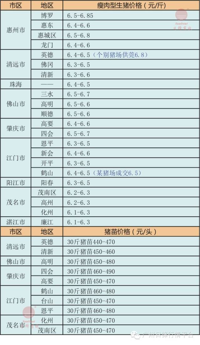 提示:以上部分猪价信息由广州日锋一线工作人员实地收集,不同地区不同猪场均有一定差异,仅供参考! (蓝色字代表当日实际成交价格)