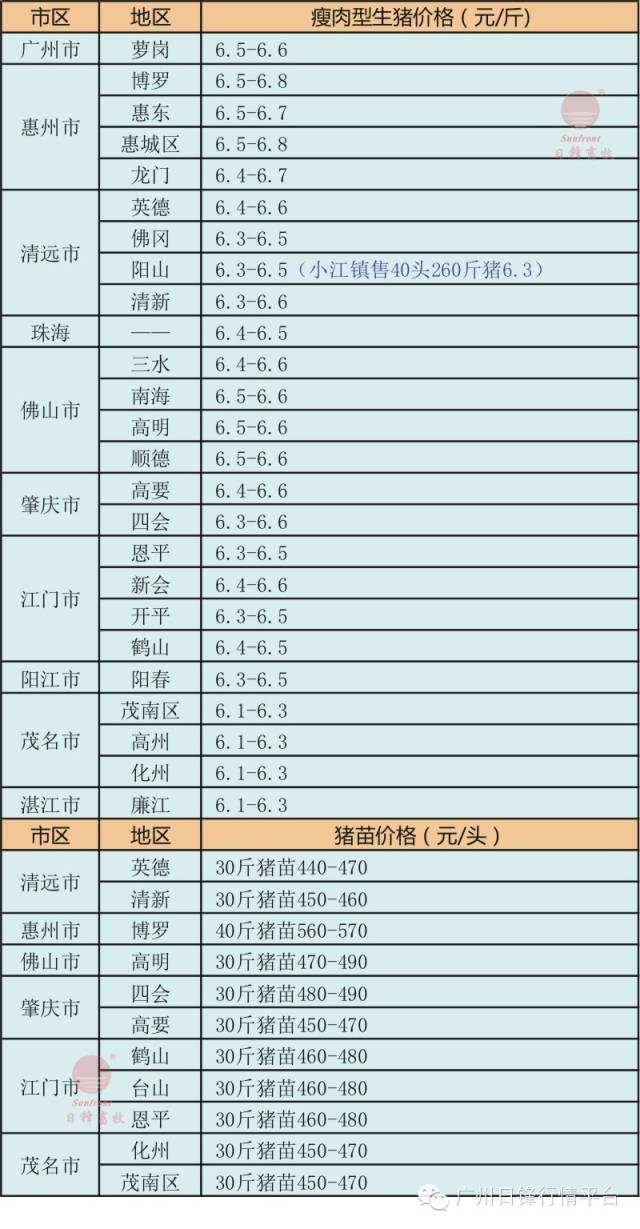 提示:以上部分猪价信息由广州日锋一线工作人员实地收集,不同地区不同猪场均有一定差异,仅供参考! (蓝色字代表当日实际成交价格)