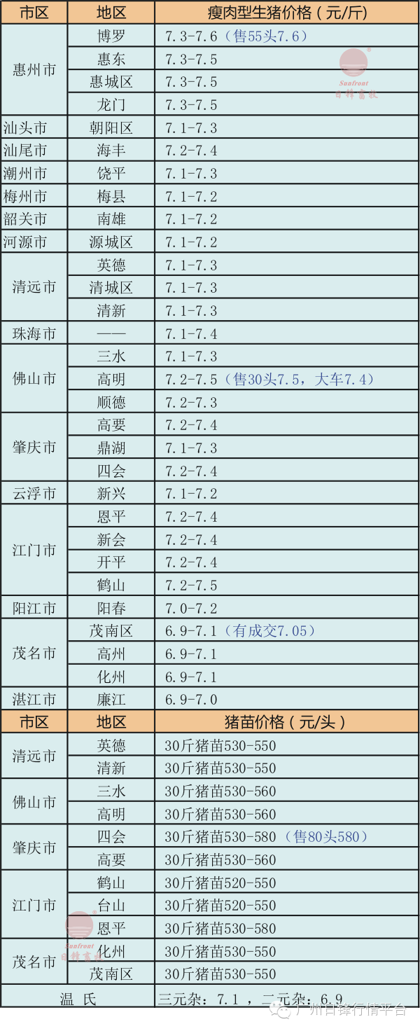 提示:以上部分猪价信息由广州日锋一线工作人员实地收集,不同地区不同猪场均有一定差异,仅供参考! (蓝色字代表当日实际成交价格)