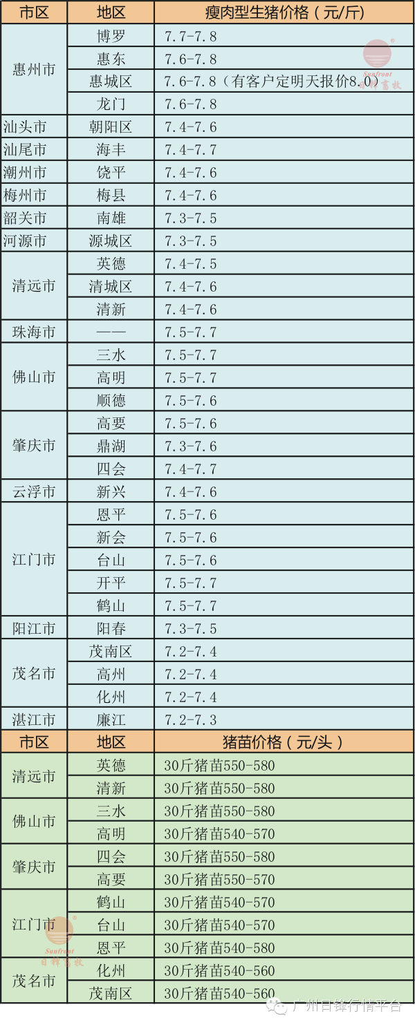 提示:以上部分猪价信息由广州日锋一线工作人员实地收集,不同地区不同猪场均有一定差异,仅供参考! (蓝色字代表当日实际成交价格)