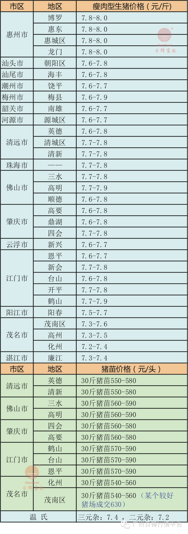 以上部分猪价信息由广州日锋一线工作人员实地收集,不同地区不同猪场均有一定差异,仅供参考! (蓝色字代表当日实际成交价格)