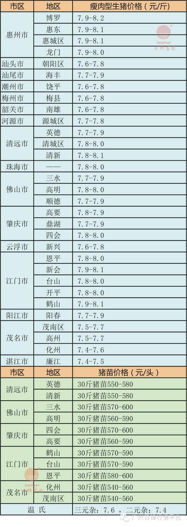 以上部分猪价信息由广州日锋一线工作人员实地收集,不同地区不同猪场均有一定差异,仅供参考! (蓝色字代表当日实际成交价格)