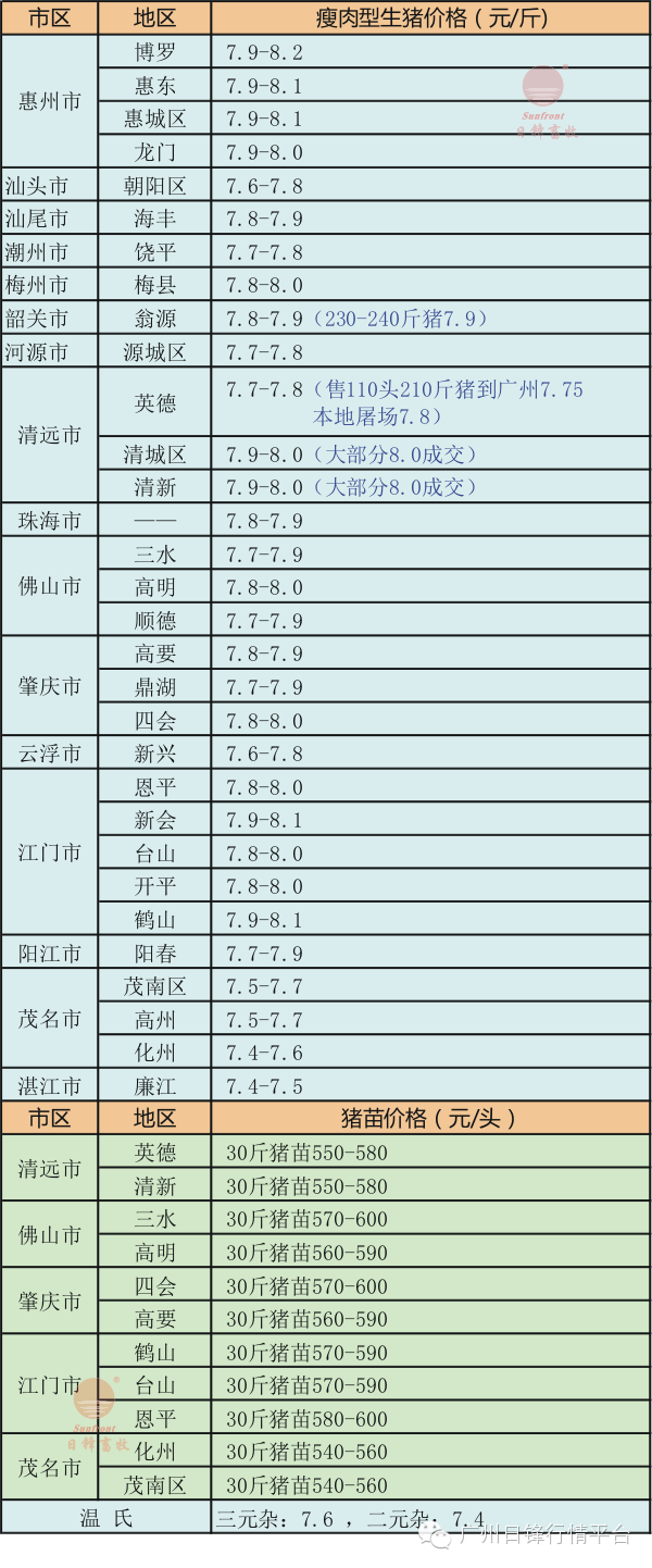 提示:以上部分猪价信息由广州日锋一线工作人员实地收集,不同地区不同猪场均有一定差异,仅供参考! (蓝色字代表当日实际成交价格)