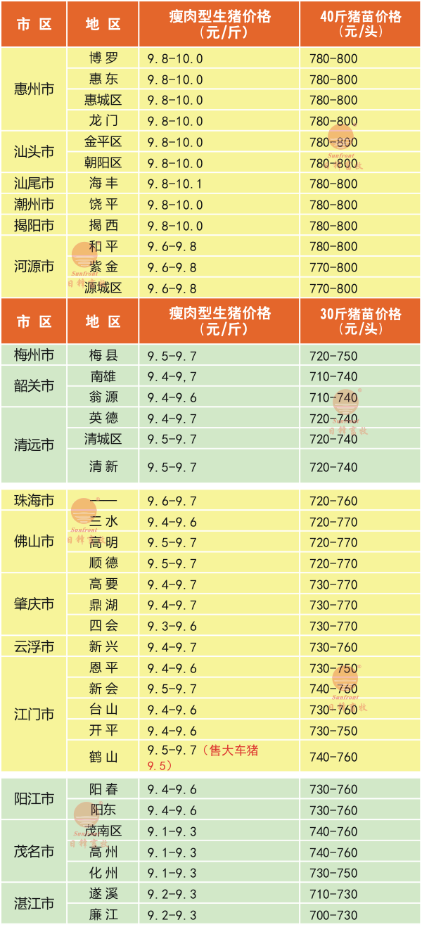 提示:以上部分猪价信息由广州日锋一线工作人员实地收集,不同地区不同猪场均有一定差异,仅供参考! (红色字代表当日实际成交价格)
