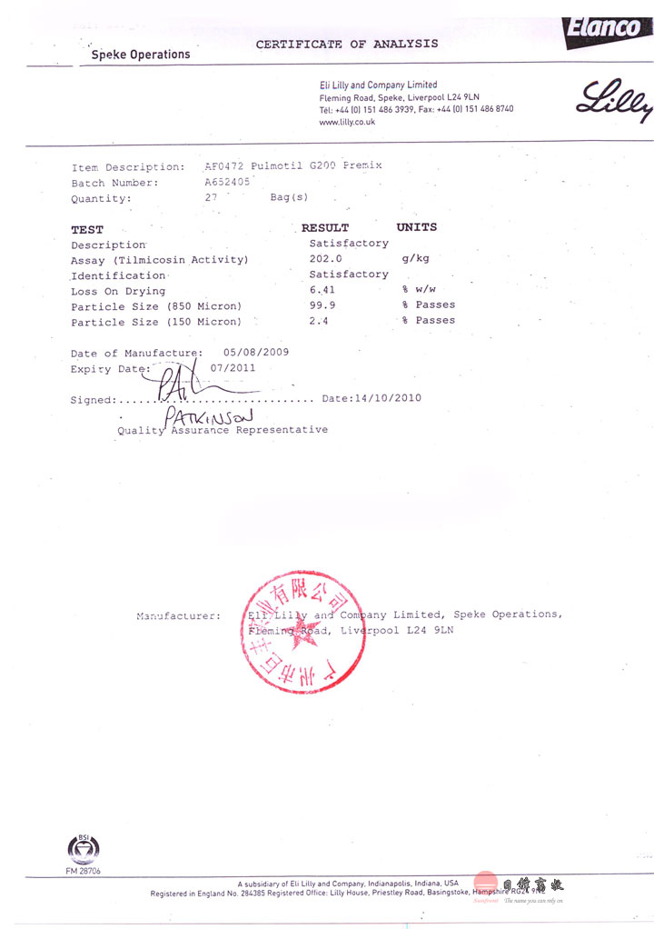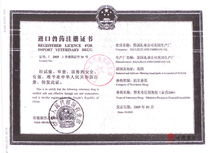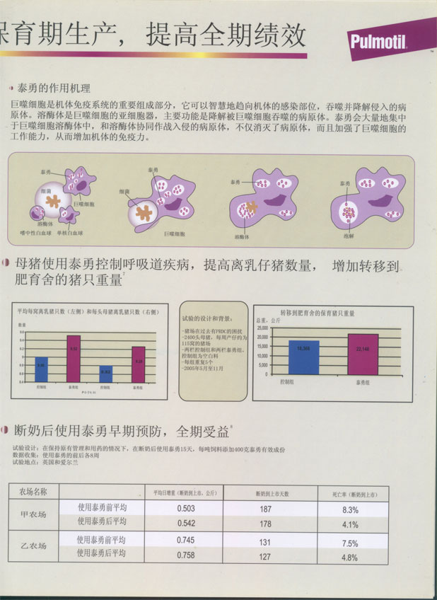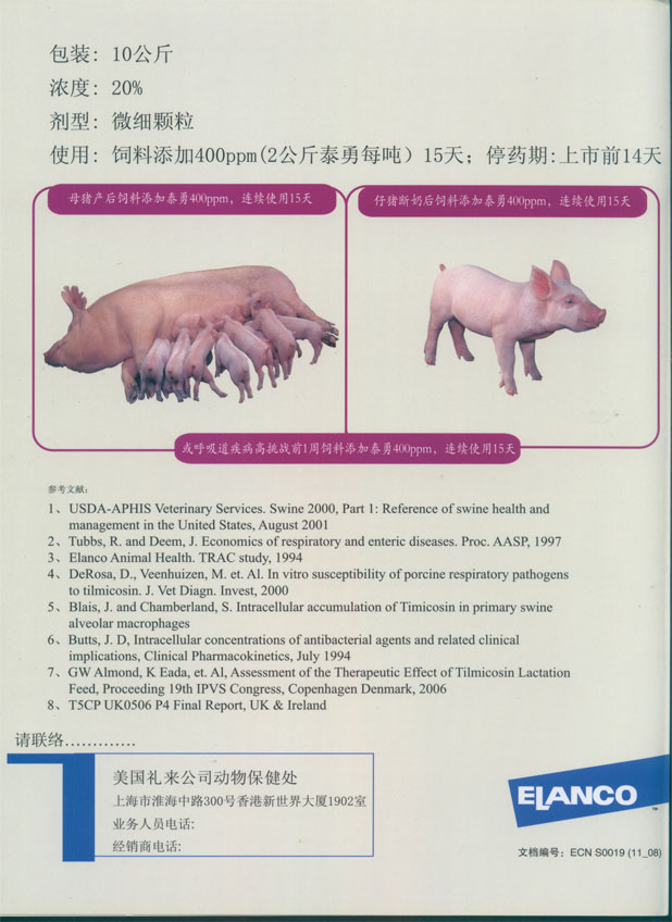 饲料中添加400ppm(2公斤泰勇每吨)15天;停药期:上市